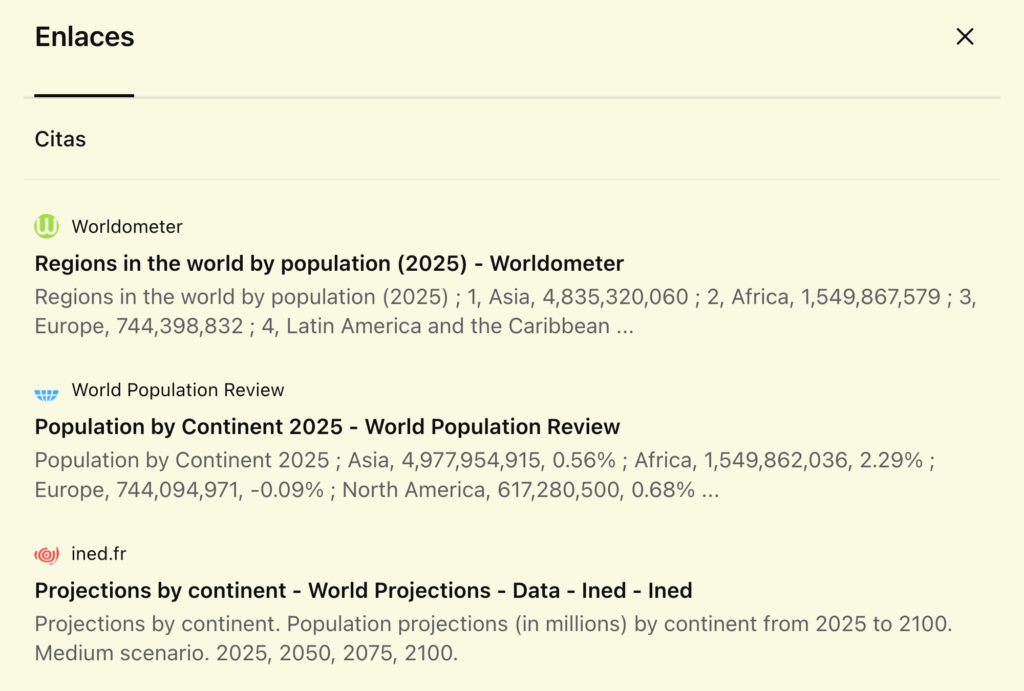 Por esta razón es necesario verificar con fuentes confiables. Una opción es indicar a la IA en el prompt que en su respuesta incluya las fuentes de donde obtuvo los datos. Hice una prueba con OpenIA, a la que solicité la población de cada continente en millones de personas, y que me indicara de dónde tomó los datos.