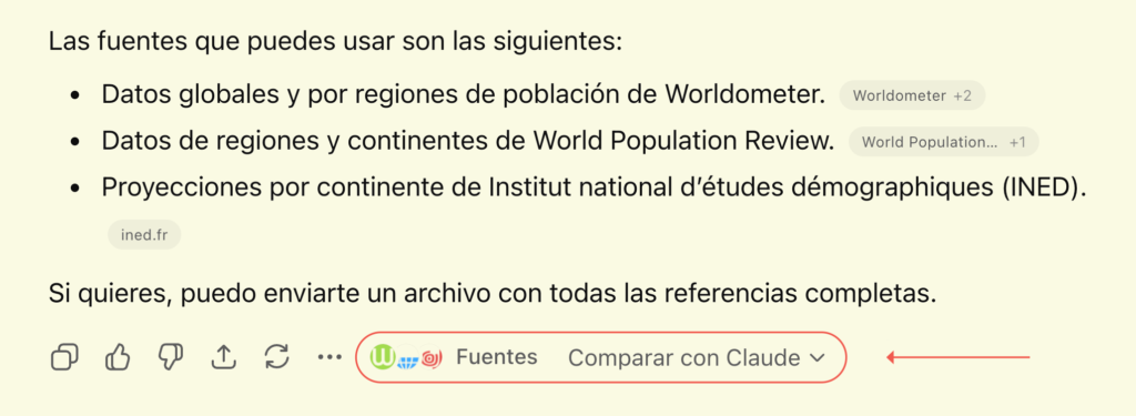 En esta ocasión, abajo de la respuesta venía un enlace («Fuentes», encerrado en rojo en la imagen de abajo) que, al desplegarlo, me las brindaba e, incluso, me proporcionaba la opción de comparar con otras IA («Comparar con Claude»). Si las fuentes están en inglés, también puede solicitarse a la IA que las traduzca, o abrir los sitios web y que el traductor del navegador lo haga.